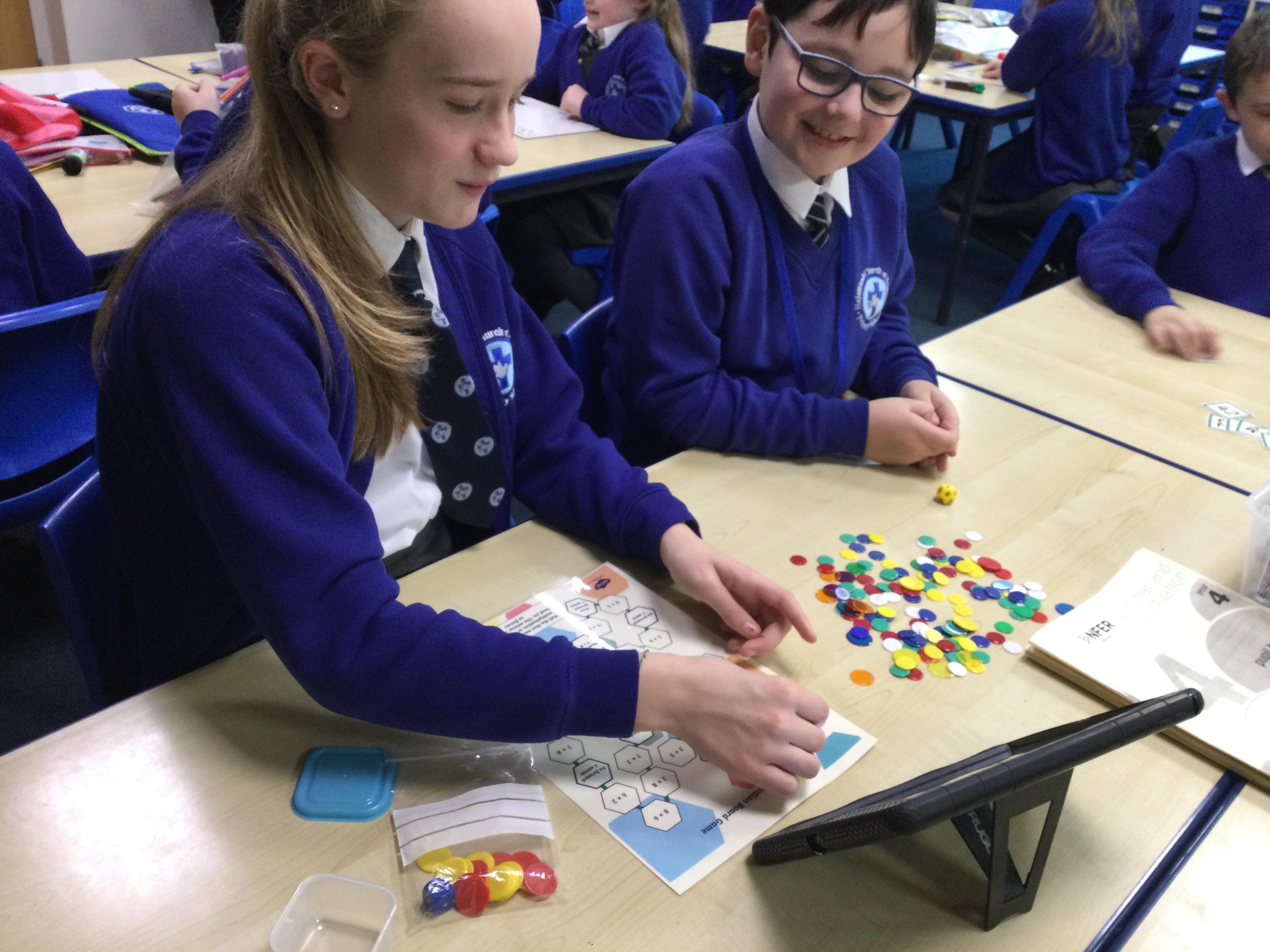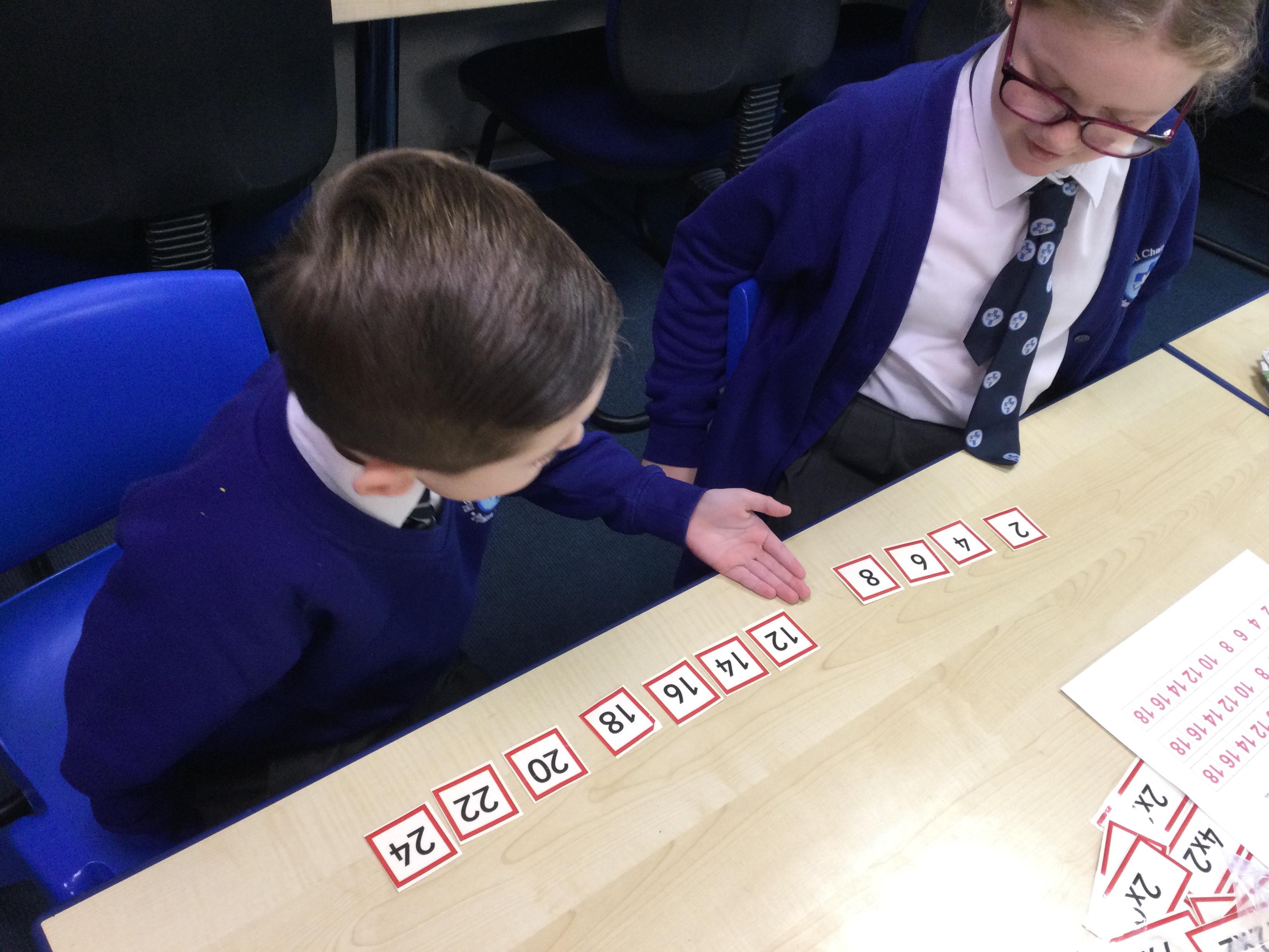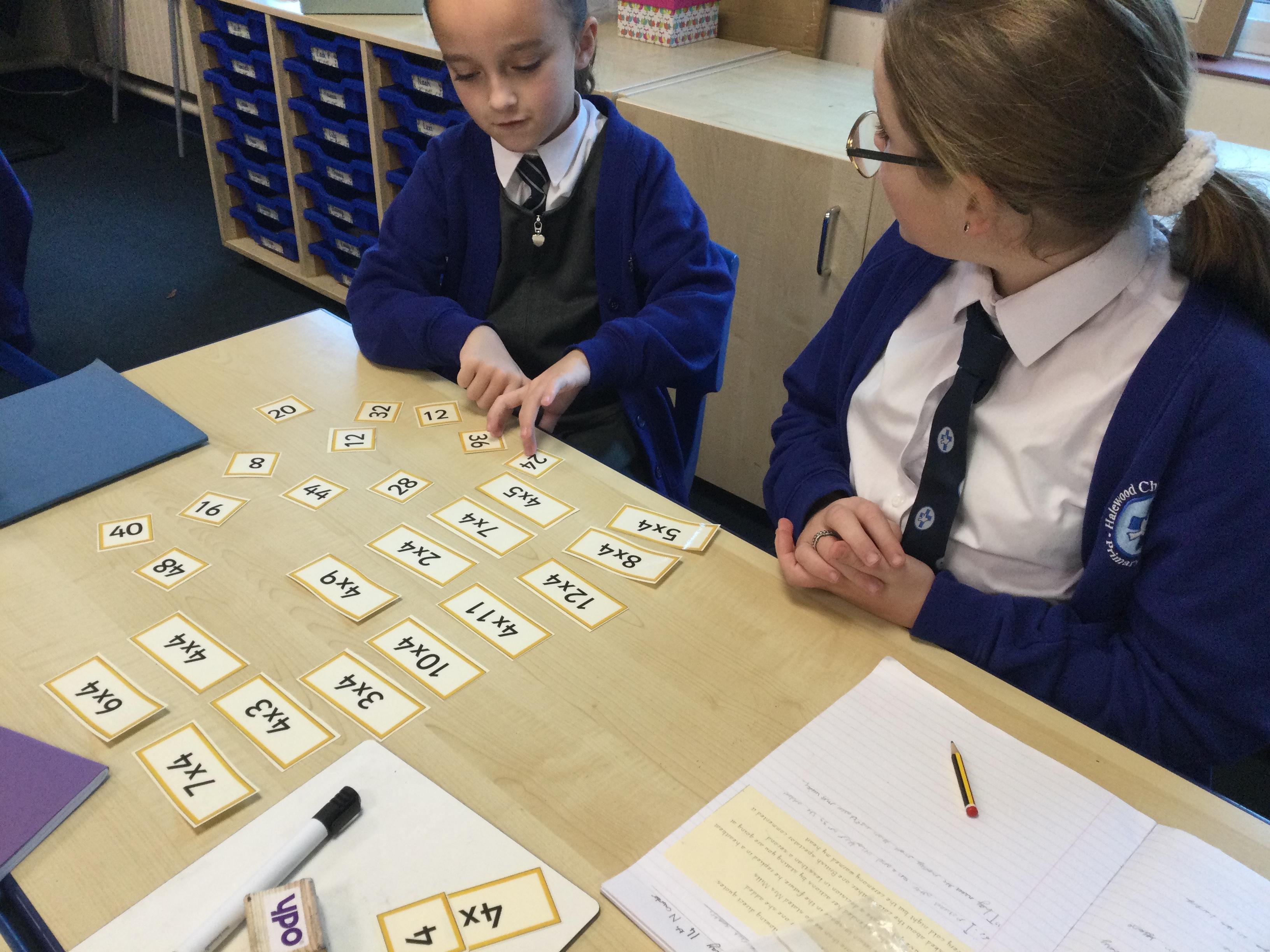 Our Year 6 children work with children across the school each week to help them to develop fluency with their times tables. They are fantastic at using concrete resources and pictorial representations to help the children to make connections and understand the relationships between multiplication and division. They love to make the learning fun and interactive; the children often go outside to make up games linked to times tables.