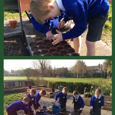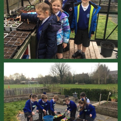 Gardening Allotments – Our ‘Grow to Learn’ allotment area consists of seven allotment plots and a greenhouse; small groups of children from across the whole school are taken each day to help with the running, cultivating and maintaining of this area. Activities involve: sewing seeds, potting on, weeding and maintaining beds, tying climbers and harvesting crops. Currently we are growing sweetcorn, onions, potatoes, runner beans, beetroot, cabbage, pumpkins, courgettes and tomatoes. Once harvested, these are shared with the whole school community. During these gardening sessions, much of the Science curriculum is covered through working discussions.